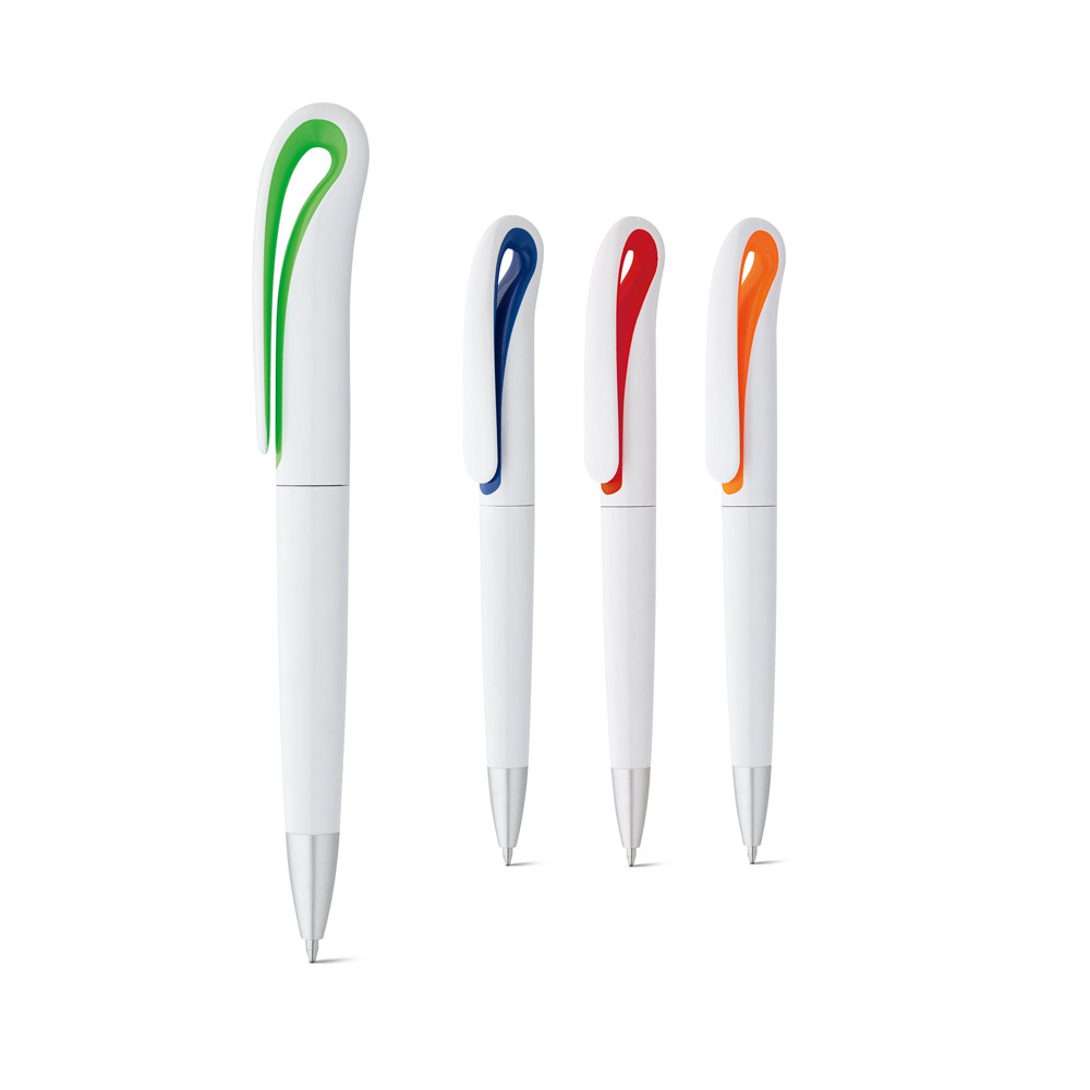 En riktigt populär profilpenna med blått bläck, välvd klämma med vita detaljer och vridmekanism.