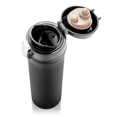 En smart termos/bilmugg med dubbelvägg som håller drycken varm i upp till 6 timmar eller kall upp till 4 timmar. Locket är låsbart och på det sättet läckage/spillsäker.